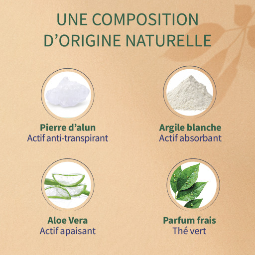 Ce produit neutralise la transpiration modérée grâce notamment aux pouvoirs de la pierre d’alun et la poudre de bambou, qui sont des actifs, respectivement anti-transpirant et absorbant naturel. Les odeurs sont également neutralisées grâce aux sels de zinc qui captent les mauvaises odeurs. Une efficacité prouvée cliniquement jusqu’à 48H. Formulé sans alcool, enrichi en aloe vera, beurre de karité, et au parfum de thé vert, le confort est maximisé pour tous les types de peaux, même sensibles, tout en laissant un parfum doux et frais
