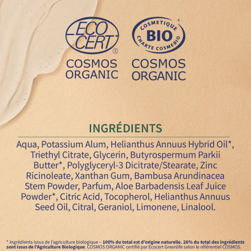 *Ingrédients issus de l’Agriculture Biologique. 100% du total est d’origine naturelle. 26% du total des ingrédients sont issus de l’Agriculture Biologique. COSMOS ORGANIC certifié par Ecocert Greenlife selon le référentiel COSMOS.