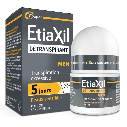 Etiaxil Détranspirant MEN permet de stopper la transpiration pendant 5 jours et assure ainsi un contrôle total, anti-humidité et anti-odeur. Appliqué sur les aisselles, le produit permet de mettre au repos les glandes sudoripares, qui cessent alors de produire de la sueur pendant quelques jours.